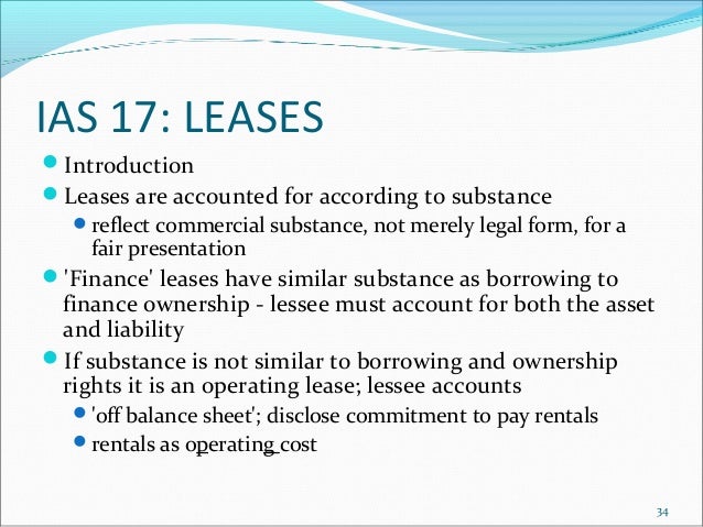IAS 17 – The accounting treatment of operating leases is less complex than the treatment of finance leases and the volume of operating leases is predominantly higher than that of finance leases. So, currently, accounting departments have a lower volume of the challenging calculations to make. ... Return Doc