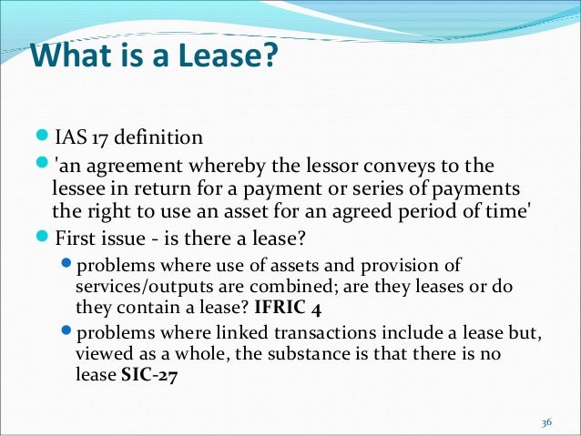 IAS 17 - Leases (detailed review) February 5, 2014 Print Email. Objective. This Standard deals with the accounting treatment of Leases for lessor and lessee and related disclosure requirements. The biological assets leased out by lessor under operating leases see IAS 41 . Definitions. Lease. ... Get Document