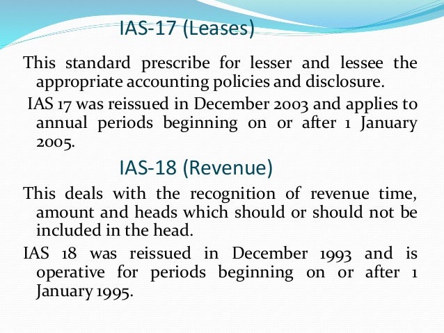 IAS 17 Leases Also refer: SIC-15Operating Leases - Incentives International Accounting Standards, and Interpretations developed by the IFRS Interpretations Committee and the former Standing Interpretations Committee), and other documents, as issued by the International Accounting Standards ... Access Content